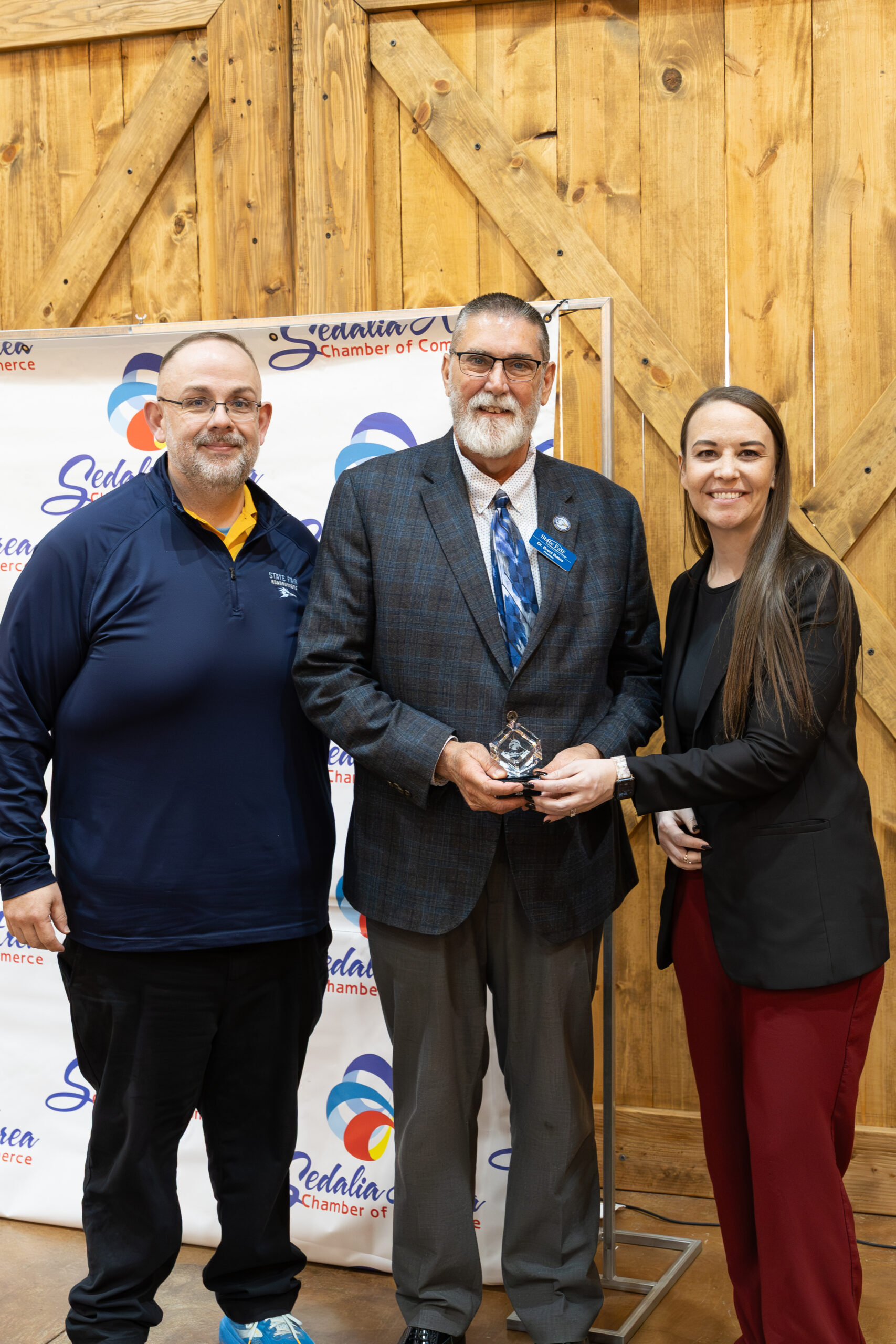 State Fair Community College President Dr. Brent Bates received the Legacy Award (Individual) from the Sedalia Area Chamber of Commerce during its annual Chamber Awards Luncheon on Friday, March 27, at the Buena Vista Event Venue.