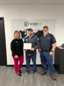 Sedalia, MO Feb. 29 — The State Fair Community College Apprenticeship Program recently presented David Williams of Otterville, the United States Department of Labor, Office of Apprenticeship, Journeyman Certificate in Industrial Electrical Maintenance. The certificate was presented at WireCo and by WireCo. Supervisor Gary Scott and SFCC Technical Education Liaison Rochelle Hockett.